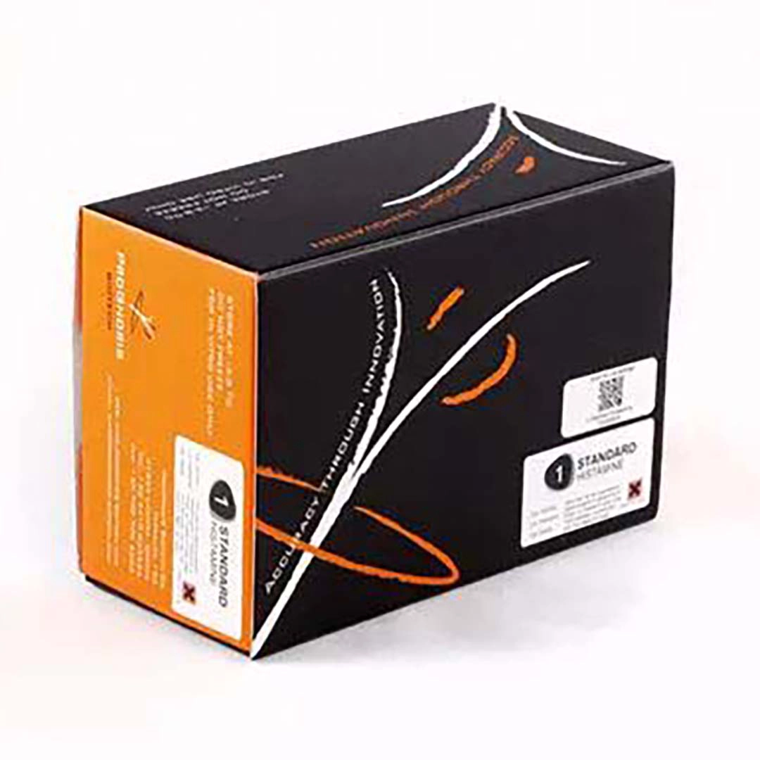 1-Standard Histamine is an ELISA test for the quantitative determination of Histamine in fresh fish, canned fish, frozen fish, and fish meal. The test provides a cost-effective, and reliable solution to the analyst, including only the standard 1 (zero standard) in the kit.GENERAL INFORMATION:Histamine (HA) is a heterocyclic primary amine and is the by-product of the decarboxylation of the amino acid L-histidine by the enzyme histidine decarboxylase. The latter is produced by certain bacteria that can be found in sea food. The most common fish species that tend to accommodate HA belong to the Scombridae family of fish (tuna, mahi mahi, marlin, bluefish, sardines, anchovy, bonito, herring and mackerel). After the fish are harvested the bacterial growth results in increasing histidine decarboxylase amounts which in turn induces HA production. High levels of HA may cause scombroid poisoning in humans which consists of various symptoms, such as rash, nausea, vomiting, diarrhea, hypotension, heart palpitations and muscle weakness. Most controlling government agencies worldwide have regulations regarding the amount of HA allowable in fish and fish products. HA levels in fish of good quality are usually below 10 ppm. HA values between 50 and 200 ppm are acceptable depending on the fish species and the country. Accurate and rapid determination of HA presence in commodities is of paramount importance.KIT CHARACTERISTICS:-Competitive Quantitative ELISA test with single-break strip plate with 48 wells (6 strips)-Only one standard needed-Limit of detection (LOD): 2 ppm of Histamine-Wide range of quantification: 2.5-200 ppm of Histamine-High specificity and sensitivity-All reagents are in ready to use format-Shelf Life: 12 months | Storage 2-8 °C