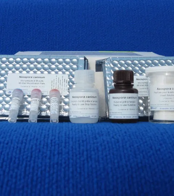 Neospora caninum detection test kit by using qPCR. Neospora caninum is responsible for neosporosis, an infectious disease for many canids and cattle. Neuromuscular degeneration in canids, which led to hind limb paralysis, and spontaneous abortion in dairy cattle were observed as major causes of disease by neosporosis. The definitive hosts are domestic dogs, coyotes, grey wolves, and dingos; where the parasite can complete their life cycle. Recent studies have broadened the list of known intermediate hosts to include birds, which can be an important link in the transmission to other animals.