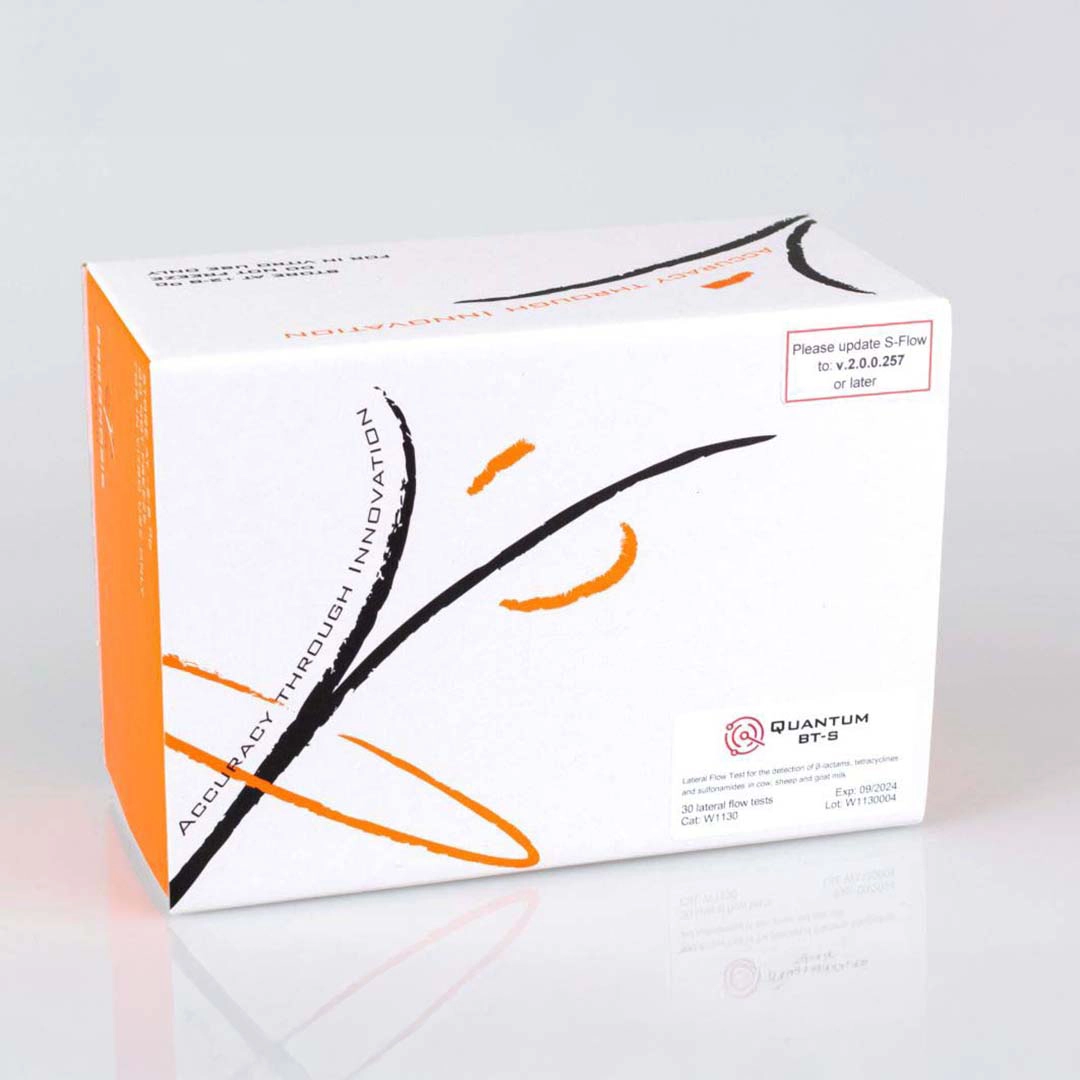 Quantum BT-S is a lateral flow test for the simultaneous detection of 3 antibiotic families, β-Lactams, Tetracyclines, and Sulfonamides in raw cow, sheep, and goat milk, pasteurized milk and milk powder. It is developed and manufactured to safely test EU MRLs and it can be used in the field or in the lab.