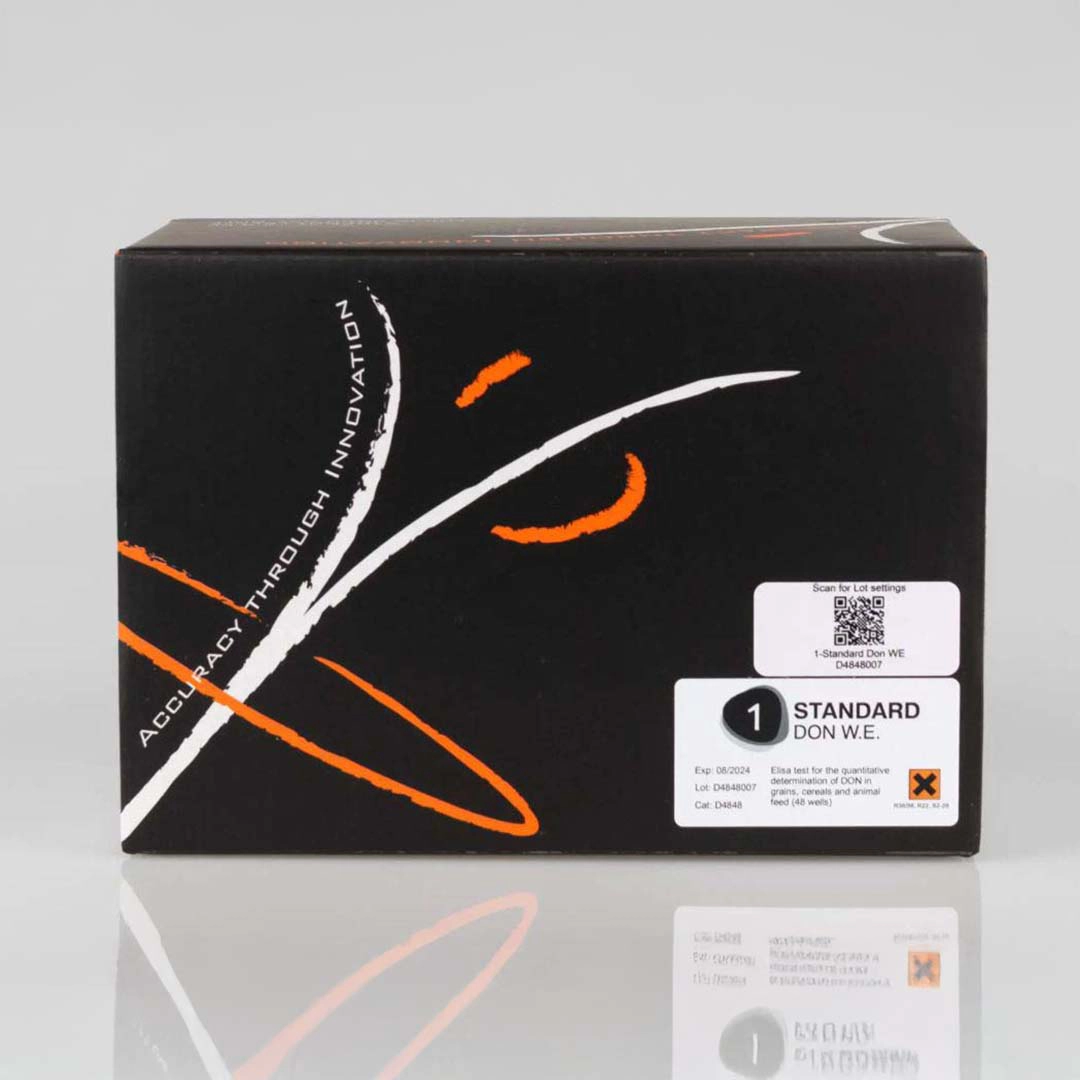 1-Standard DON W.E, é um método de imunoensaio para a determinação quantitativa de Deoxinivalenol em grãos, cereais e rações para animais. O teste fornece uma solução económica e fiável ao analista, incluindo apenas o padrão 1 (padrão zero) no kit.