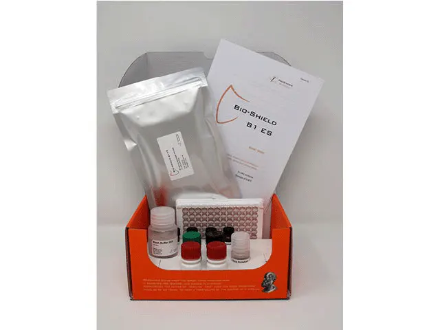 Método ELISA de 48 ou 96 poços, quantifica Aflatoxina B1 na faixa de 2,5-50 ppb em cereais e ração animal, nozes, frutas secas e especiarias, ajustado ao limite da legislação da UE de 10 ppb, em 20 minutos. Extração de metanol a 70%.