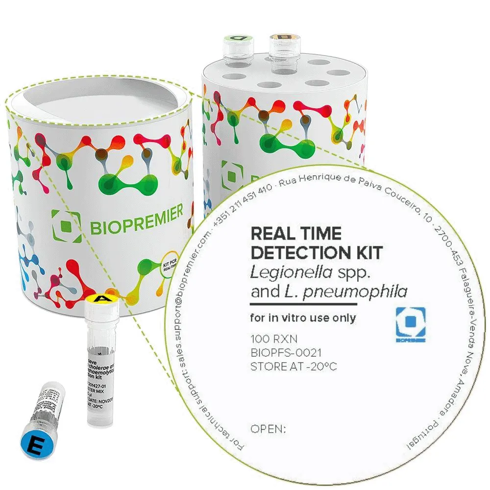 Kit de PCR Teste para a deteção de Legionella spp. em águas. As amostras de água devem ser concentradas de acordo com ISO 11731. O kit é para ser usado em equipamentos PCR em Tempo Real com os canais de deteção FAM e ROX