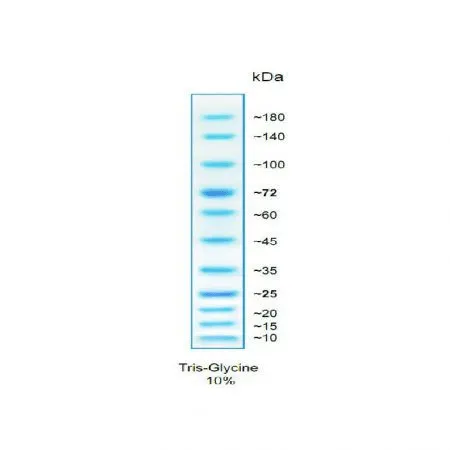 Soluções de alta pureza para coloração e para aplicações de remoção de anticorpos PRODUTO: Marcador de proteína pré-corado pronto para usar, adequado para monitorar a separação de proteínas durante SDS-PAGE, verificação da eficiência de transferência de Western em membranas e para estimativa do peso molecular de proteínas e / ou polipeptídeos na faixa de 10-180kDa . O GRS Protein Marker Blue é composto por 11 bandas azuis, incluindo 2 bandas de referência com cores mais intensas para fácil identificação (~ 25kDa e ~ 72kDa).