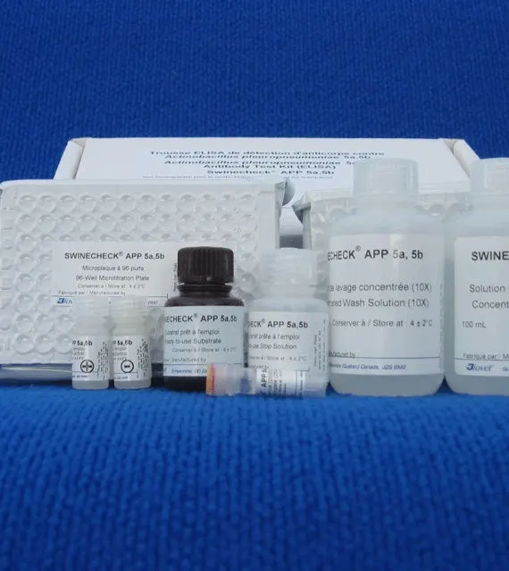 Este é um ensaio imunoenzimático para a detecção de anticorpos contra os serotipos 10-12 de Actinobacillus pleuropneumoniae em soro suíno. Pode ser usado em complemento ao kit Swinecheck® mix-APP 1-2-9-11, 3-6-8-15 e 4-5-7.