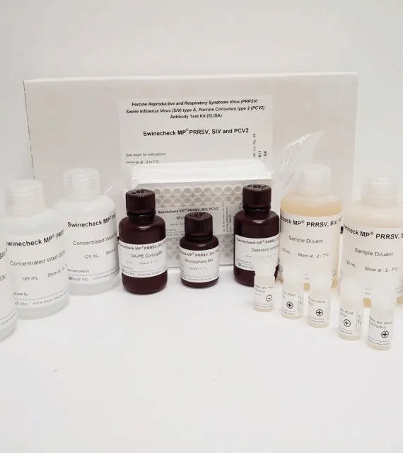 O ensaio Swinecheck MP® PRRSV, SIV, PCV2 é um imunoensaio mutiplex destinado a determinar a presença de anticorpos para o vírus da síndrome reprodutiva e respiratória suína (PRRSV) tipos 1 e 2, vírus da gripe suína (SIV) tipo A e circovírus suíno tipo 2 ( PCV2) em soro de suíno.